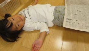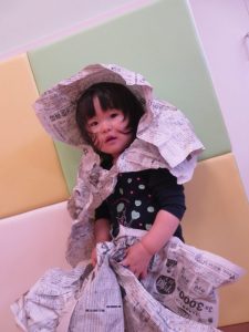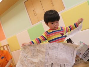 新聞紙遊びも絶好調で、大きい新聞紙を破いたり
