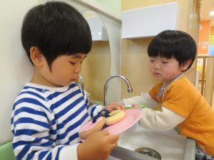 おままごとでは、食べたあとのお片付けも忘れずに、お皿を運んだり洗ったりしてお友だちと分担して楽しまれていました![]()