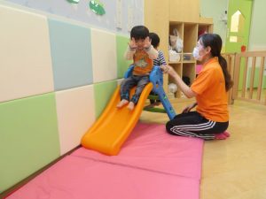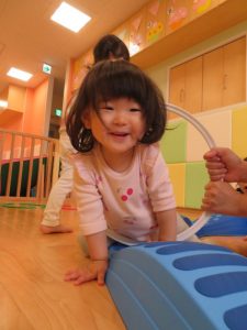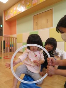 雨が降る日は、お部屋での遊びが多くなりました。お部屋では、すべり台や平均台、マット遊びの運動遊びや制作、ブロック遊びやままごとといった遊びをしながら、お友だちとの関係もより深まってきました