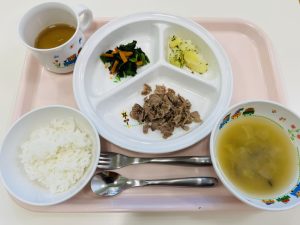 ご飯 すまし汁 豚肉のしょうが焼き ほうれん草のお浸し 粉吹芋