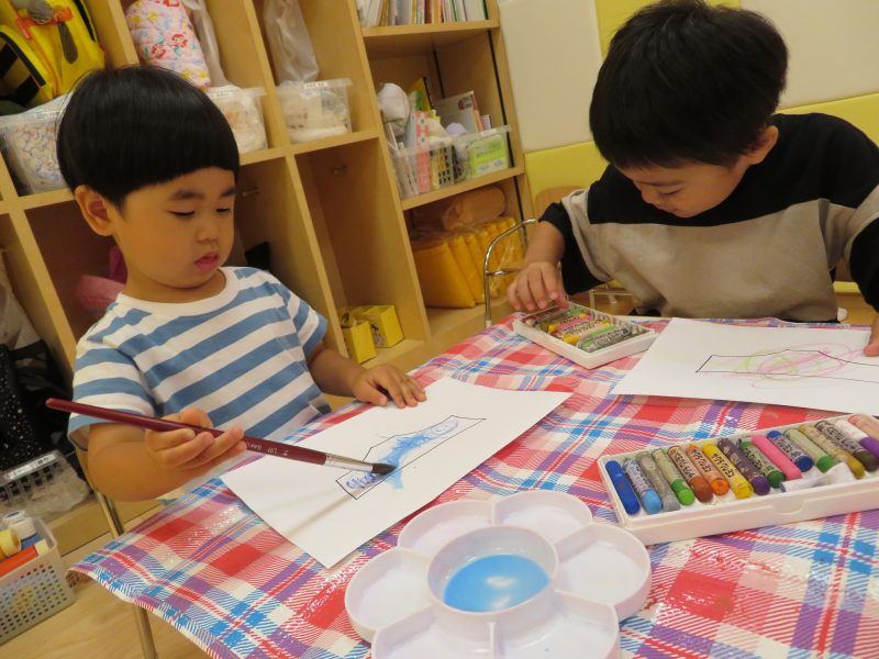 「クレヨンで描いた後は、上から絵の具で塗り塗り