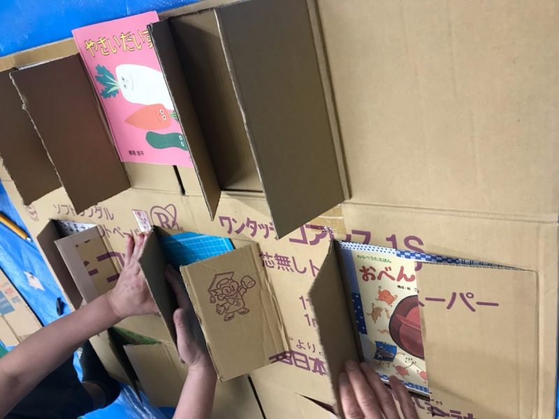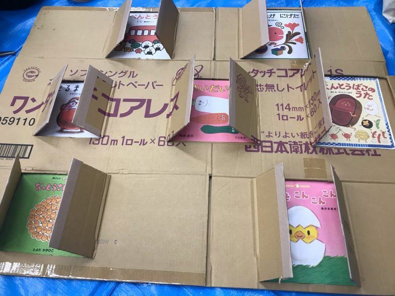 私たちのグループでは、子どもたちが大好きな絵本をカラーコピーをしてダンボールに張り付けてその上に扉をつけました
