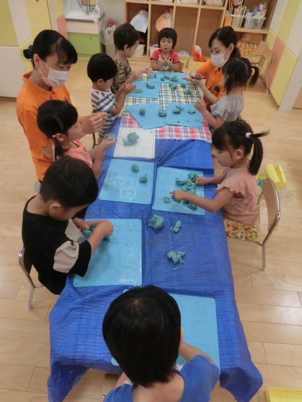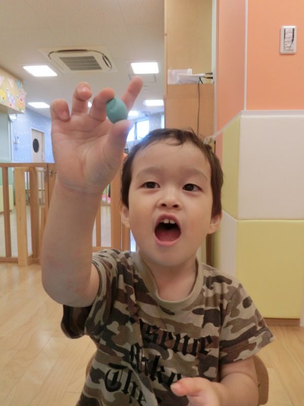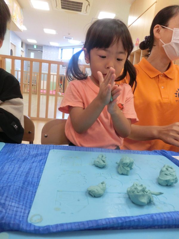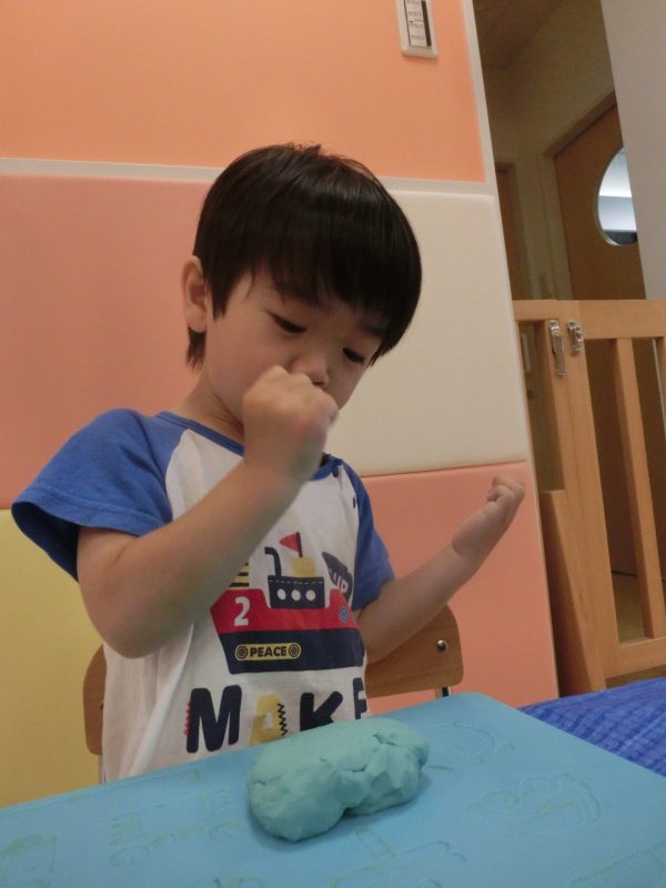 たくさん遊んだあとは、椅子に座ってじっくりと粘土遊びをしました![]()