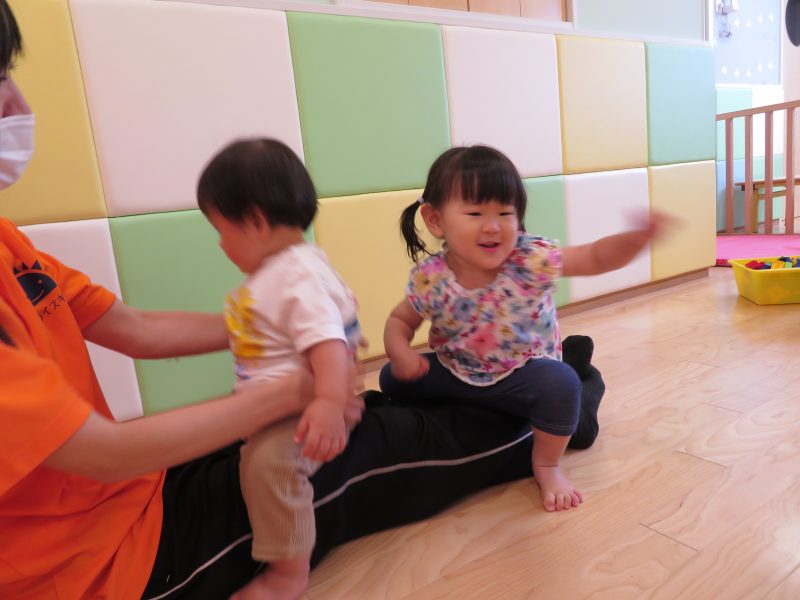 またまた別の場面での触れ合い遊びでは、保育士の膝の上に目一杯のってバスごっこ![]()