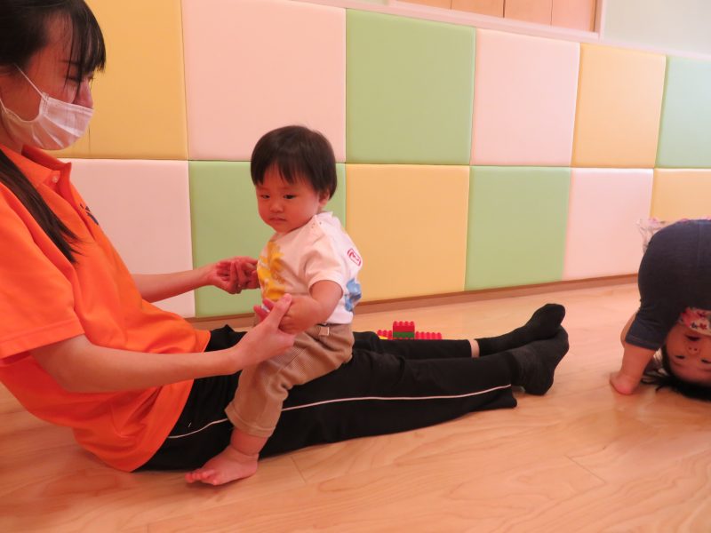 ダンスの他に、保育士が膝の上で触れ合い遊びをしていると、隣りで足を広げて覗いて遊んでいるいちご組さんが、横で遊んでいることに気付いて