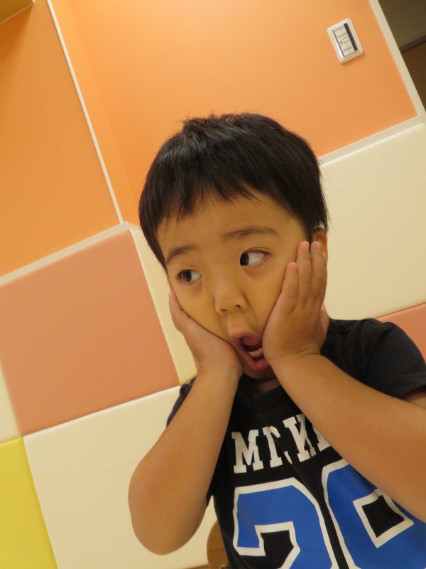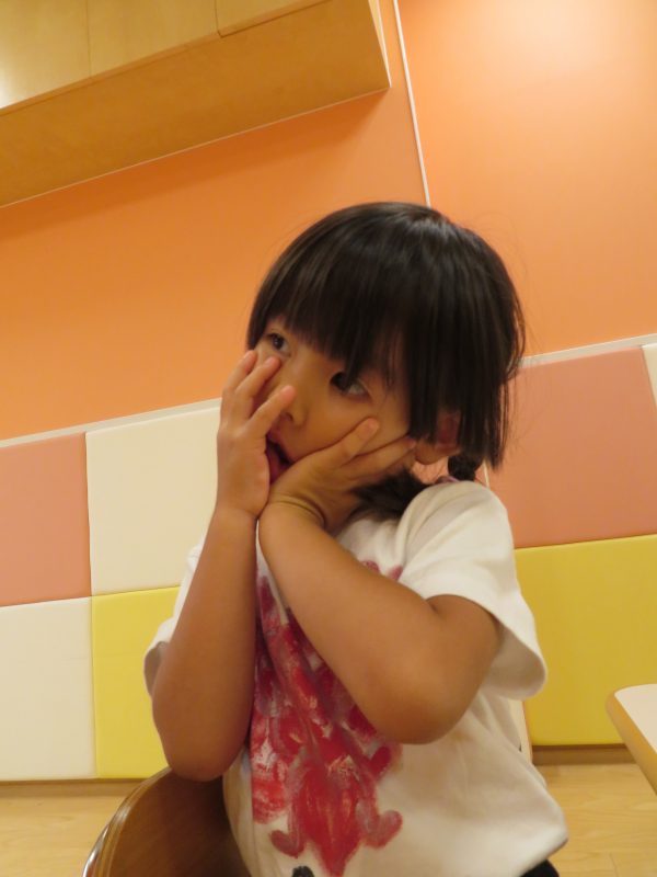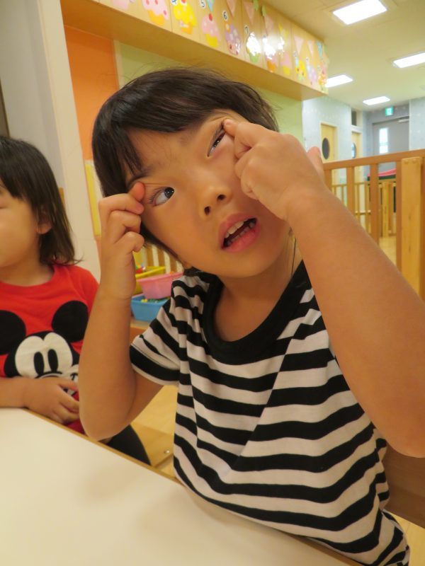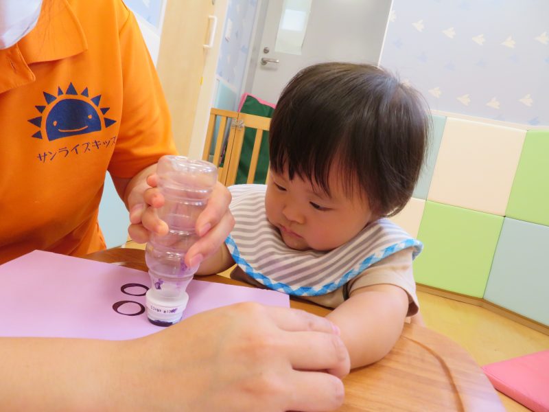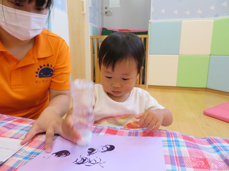 保育士と一緒にぺたぺたとスタンプをして不思議そうな、またまた「なぁに![]()
