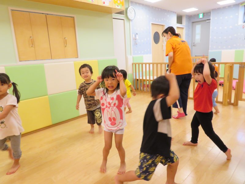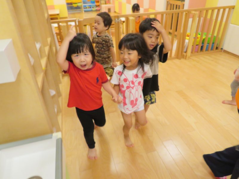 お部屋では、リトミックで鬼になりきってお部屋を走るまわる子どもたちです![]()