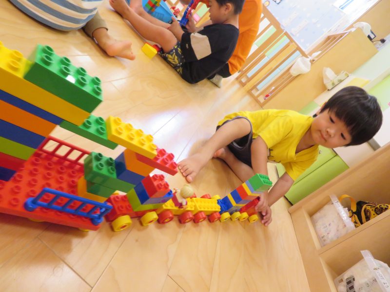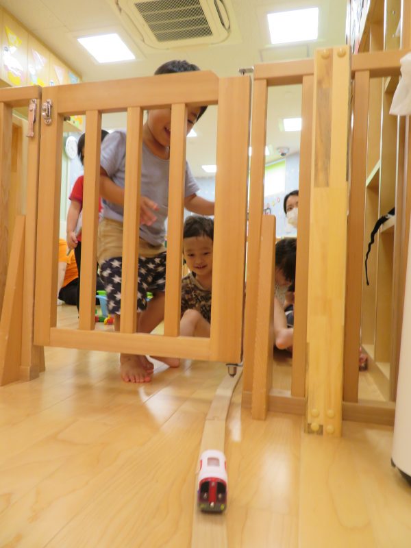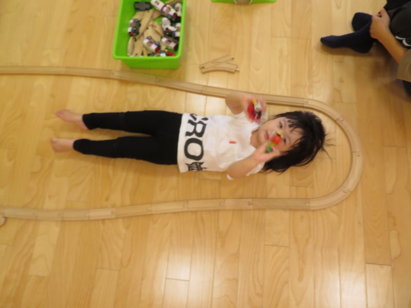 2人で、お部屋の中から線路を前後に動かして、線路の上に乗っている電車が倒れるかどうかみていました。その時の盛り上がりが