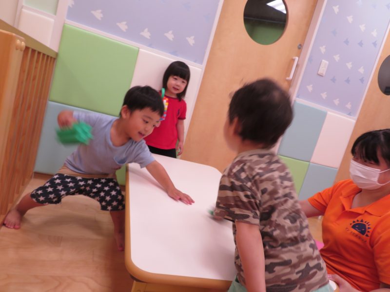 お隣りのお部屋で、りんご組さんといちご組さんが鬼役をしているのをみて、もも組さんも真似っこ![]()