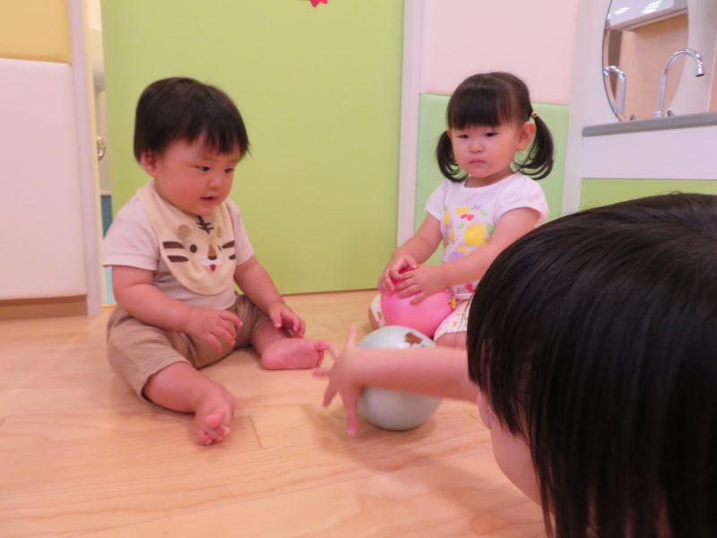僕はお姉さんにボールを転がして遊んでもらってるの