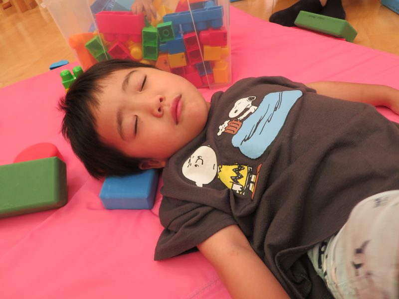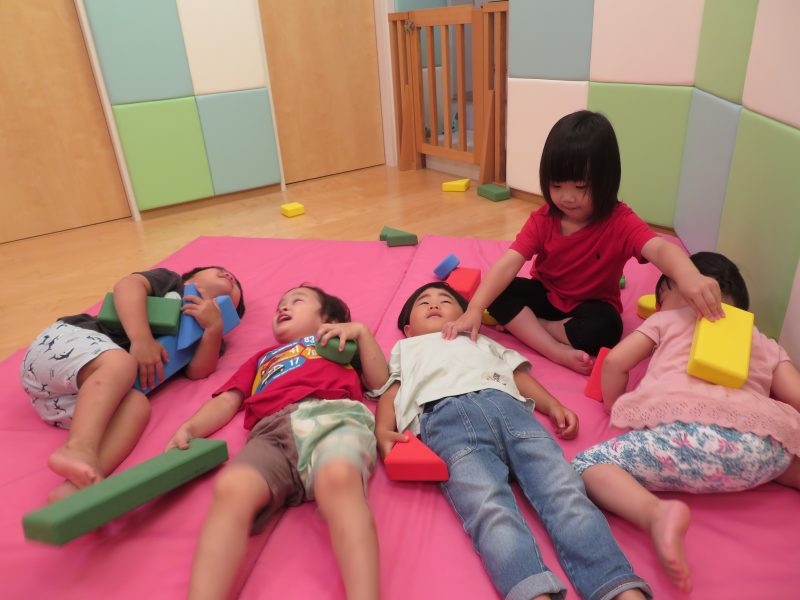 また、午睡で保育士が子どもたちに背中をさすったりトントンしているのを思い出して、先生役と子ども役に分かれて楽しまれていました。