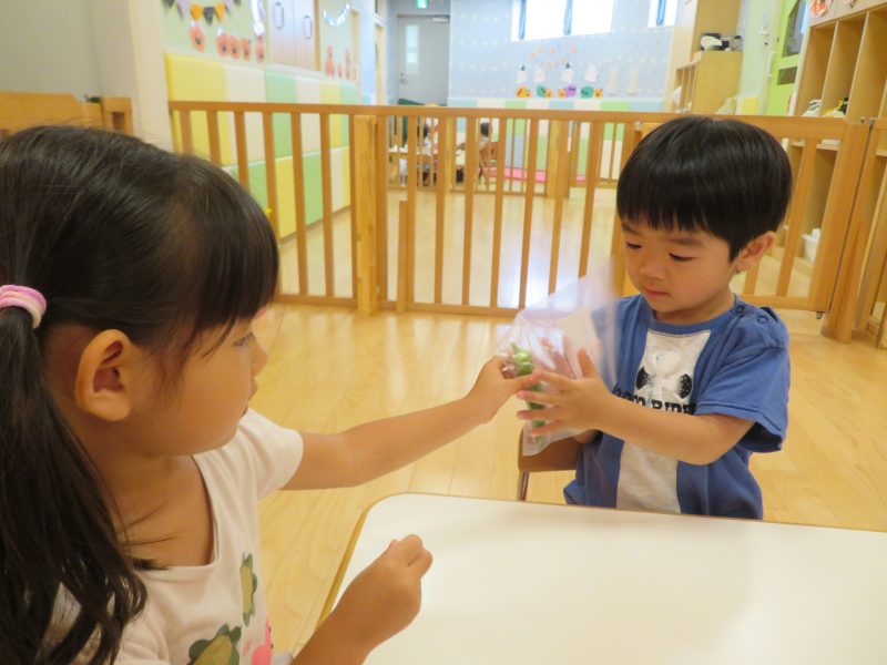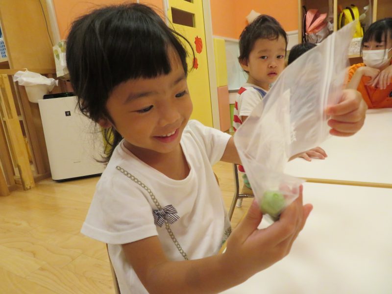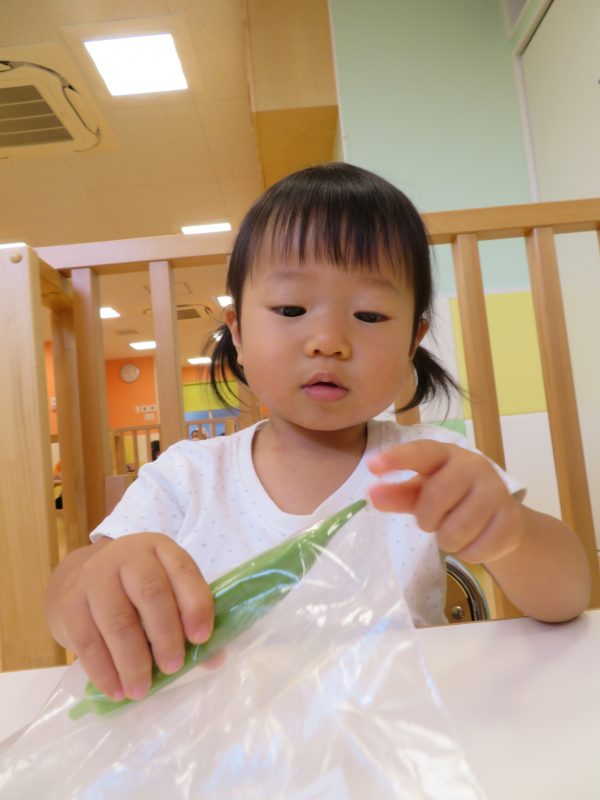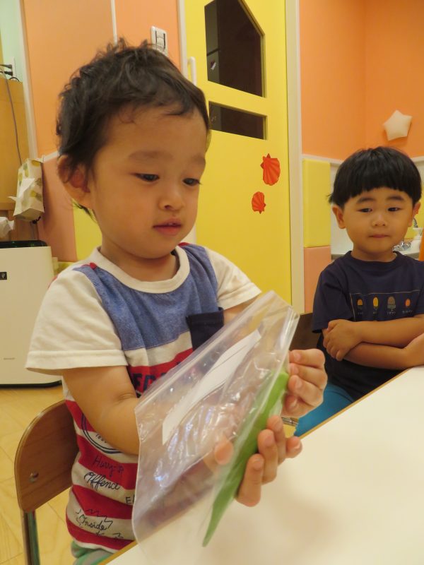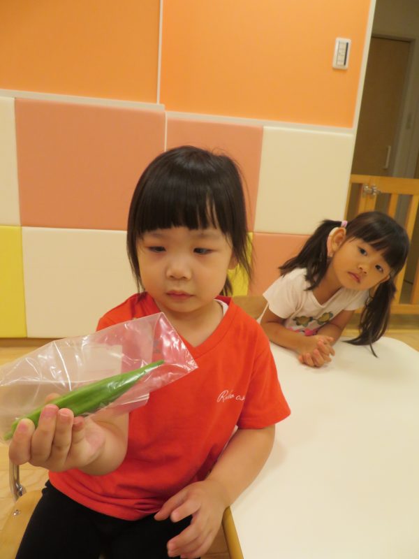 先週のオクラですが、立派に大きくなりついに収穫させていただくことになりました最初の記念すべき1本目ですオクラを袋に入れて、朝のおやつの時間の前にオクラを見てもらいましたみんな興味津々で、じっくりと見てくれました