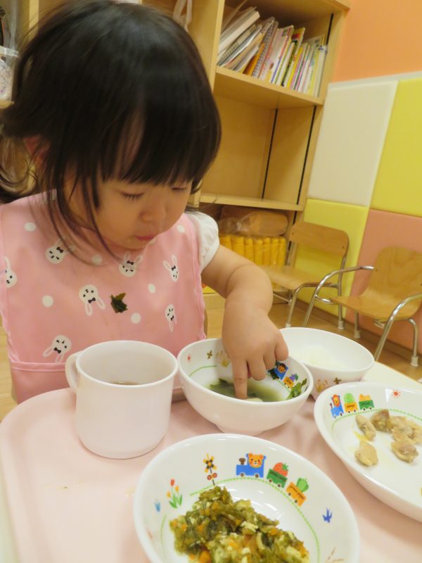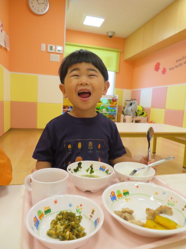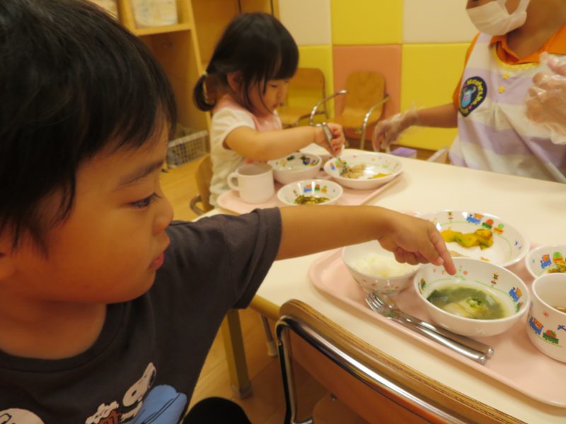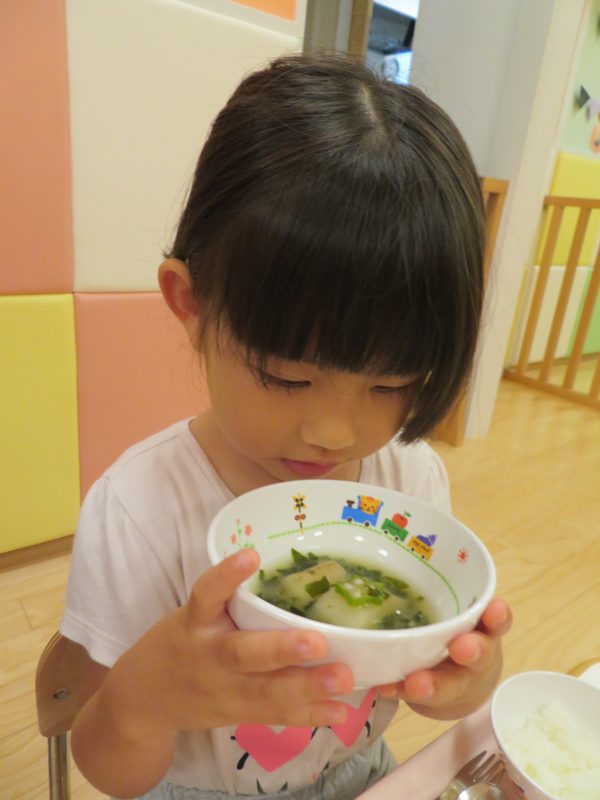 さてさて、お散歩から帰ってくると、給食の先生が朝見た1本のオクラを切ってお味噌汁の中に入れてくれましたそれを見た子どもたちは大喜び保育園で育てたオクラを採って、見て、食べるっていろんな感動があるでしょうね