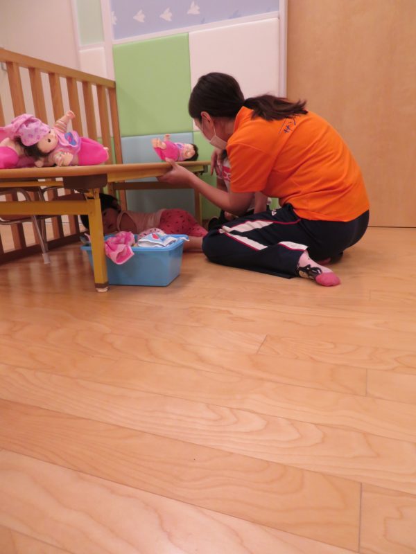 そのあとの遊びでは、子どもたちが保育士の真似をして「地震です