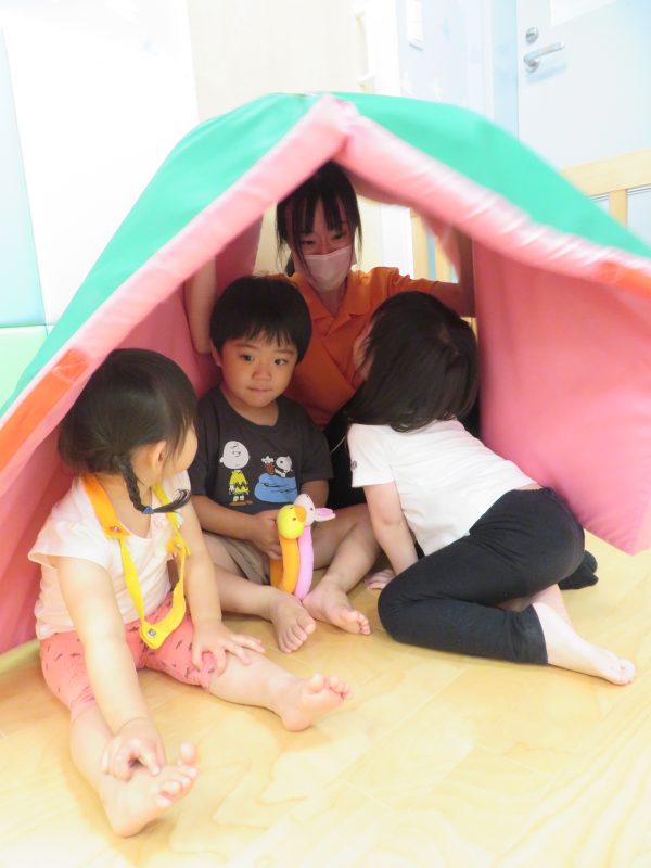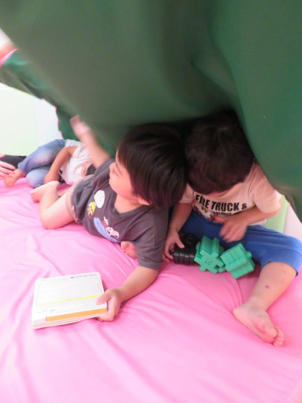 」と保育士のかけ声が聞こえてきて、お友だちと一緒に近くにあったマットの下に隠れました![]()