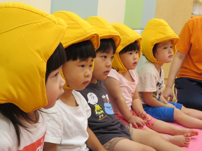 避難訓練後の保育士からのお話しでは防災頭巾をかぶって、とても上手にお話しを聞いていました![]()