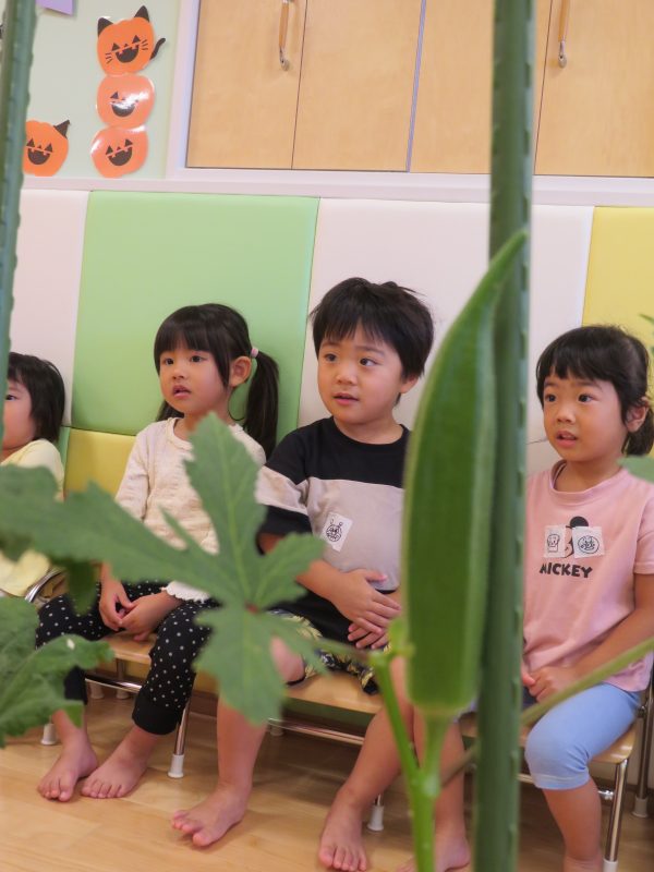 みんなでオクラを見た後は、給食の先生にオクラを渡してお散歩に出かけました![]()