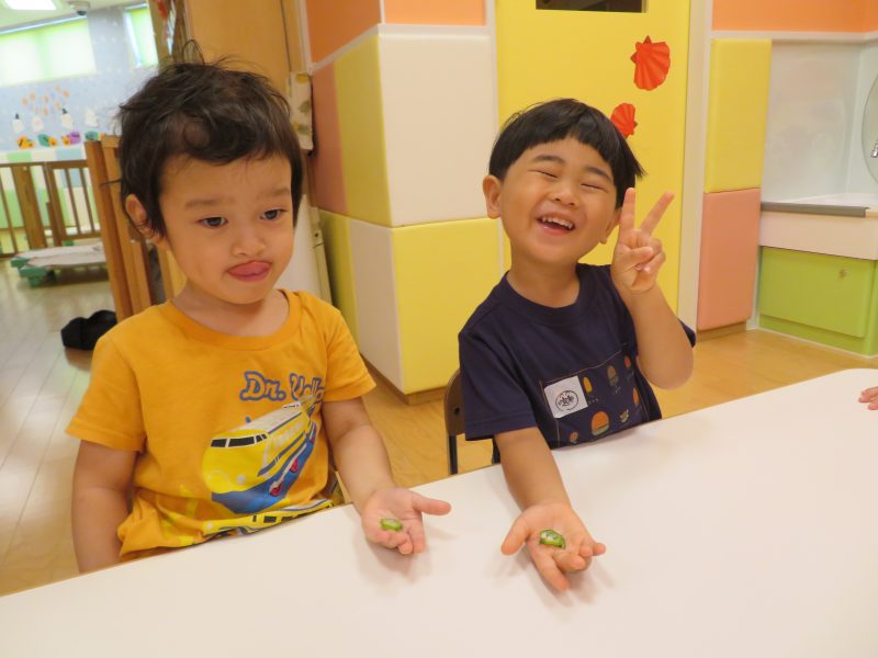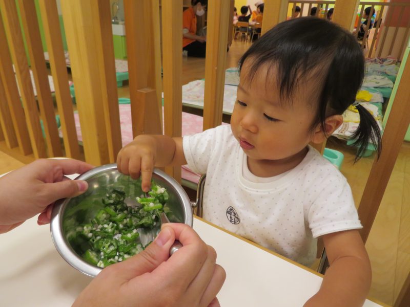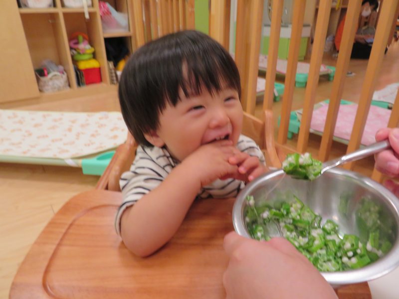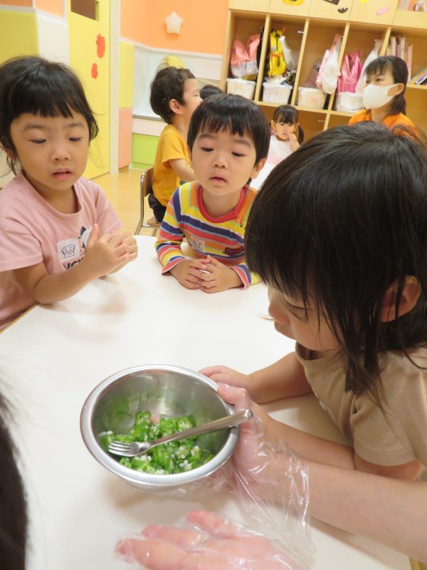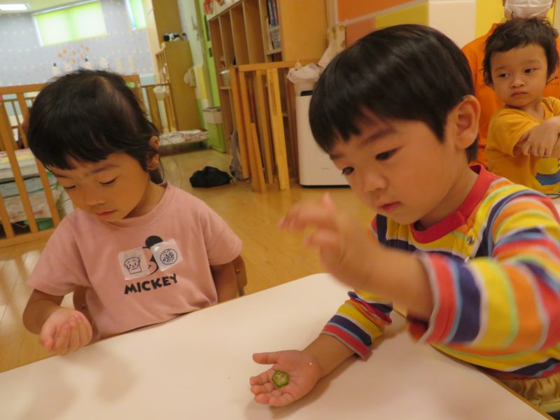 今回は、オクラが大きくなりすぎてしまったので、給食の前に見たり触ったりしました![]()