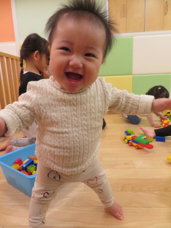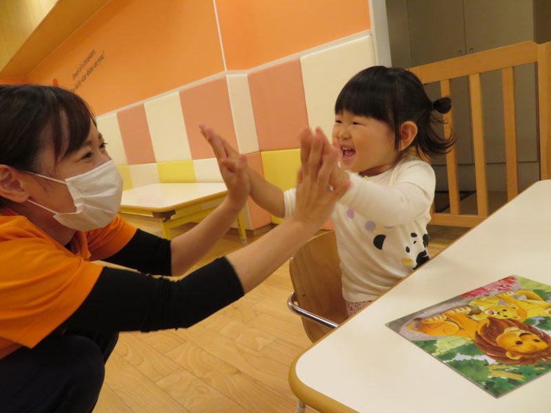 嬉しくてにっこり、保育士と思わずハイタッチ