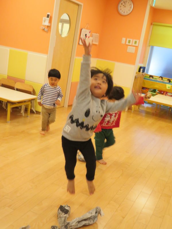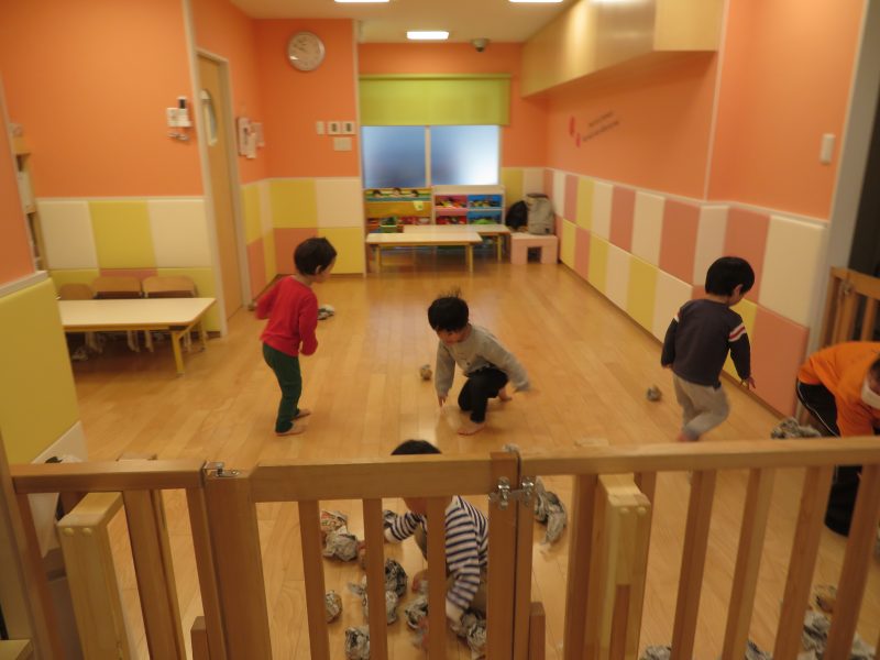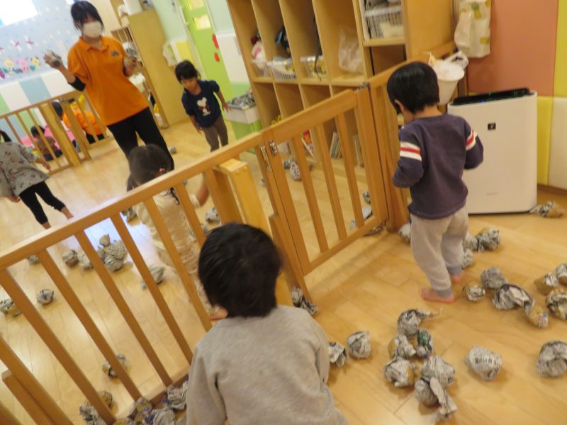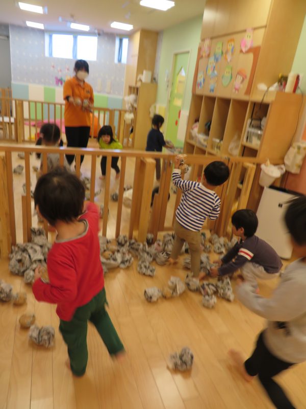 2つの部屋で、男の子と女の子に分かれて新聞紙ボール合戦をしました