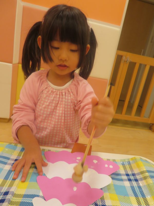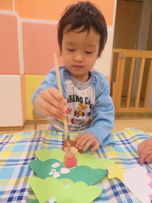 トントンと塗り、絵の具で塗ったりシール貼りをしたりして作られていました