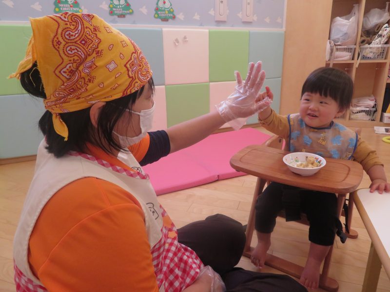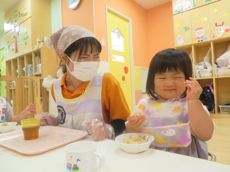 保育士やお友だちに励まされて、自分で少しずつ頑張って食べていました