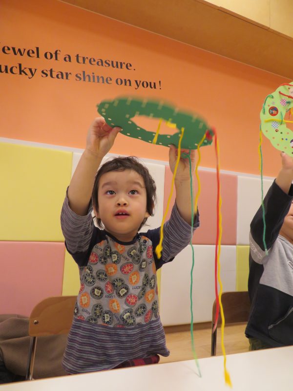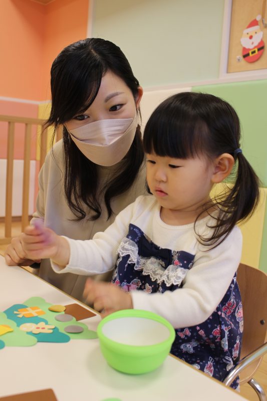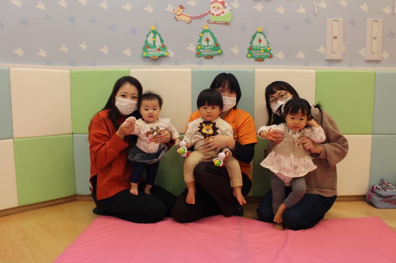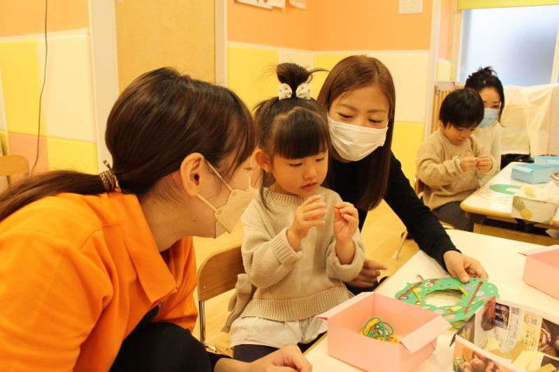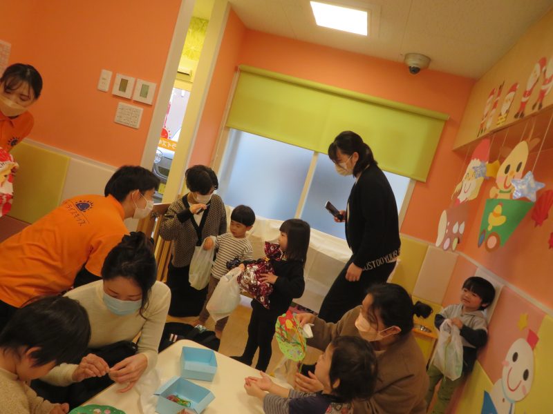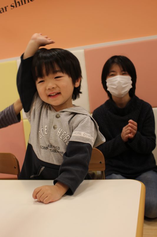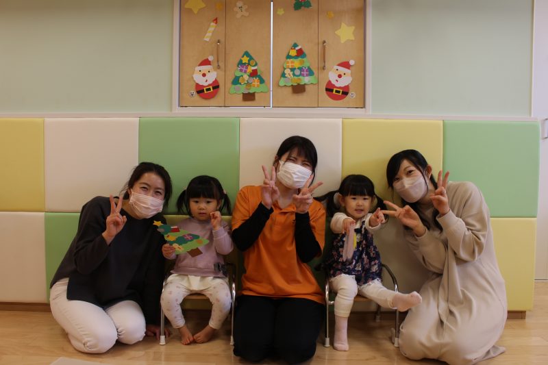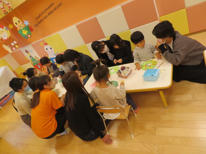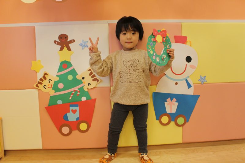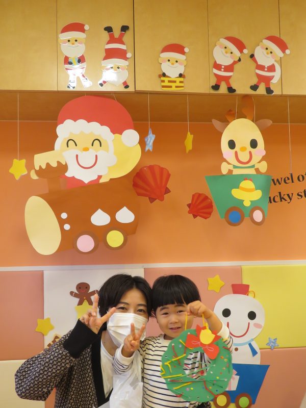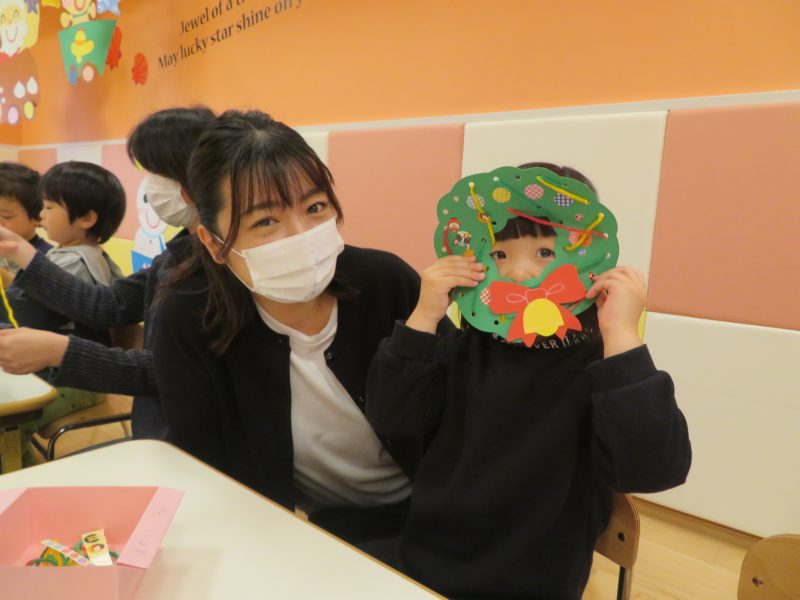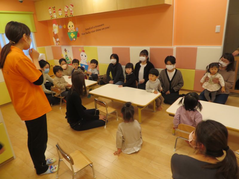 親子参観では、フラッシュカードやクリスマス手遊び、朝の会でいつもしている「お返事はい」をしたり、クリスマス系の歌を歌ったり、子どもたちがリクエストしてくれたアンパンマンやミッキーの歌を歌いました