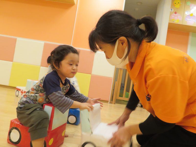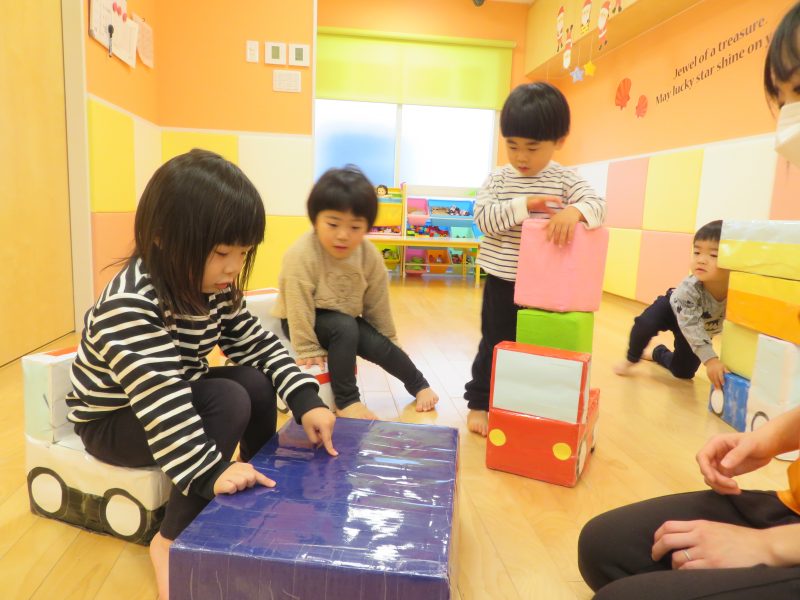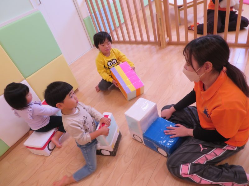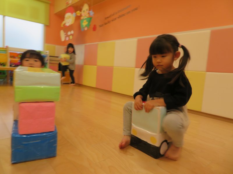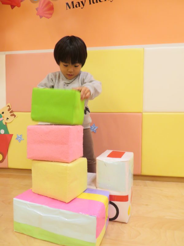 遊びを自分で考えて、箱を積み上げてみたり、荷物に例えてみたりして楽しまれていました![]()