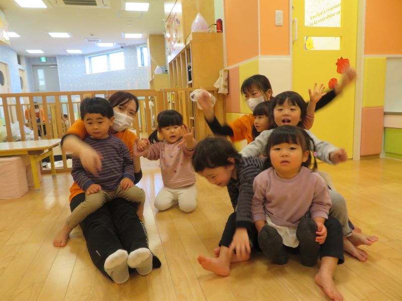 触れ合い遊びでは、保育士の膝の上に乗って「いえーい」とテンション高めバスごっこを楽しまれていました