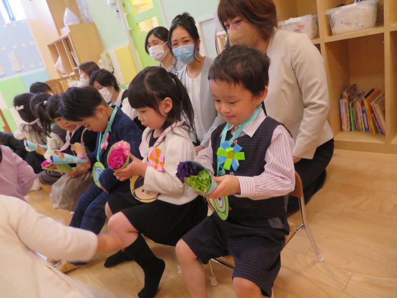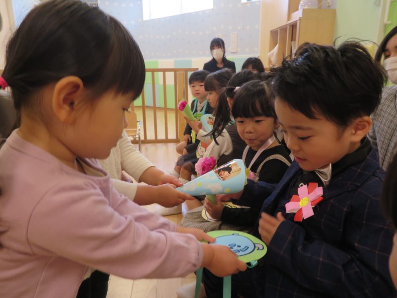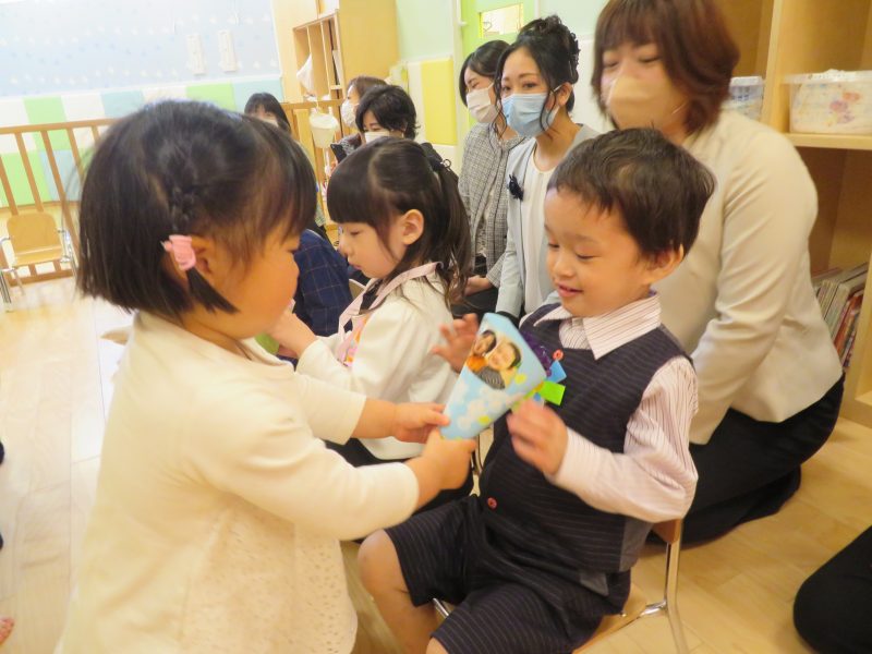 在園児さんからは、プレゼントを受け取りました。ドキドキとしながらも、1人ずつ今までありがとうと楽しかったよと言ってるかのように渡されていました。りんご組さんは、1人ずつ受け取ると、嬉しそうににっこりな表情したり、受け取ったプレゼントを大事そうに手に握りしめられたりされていました。