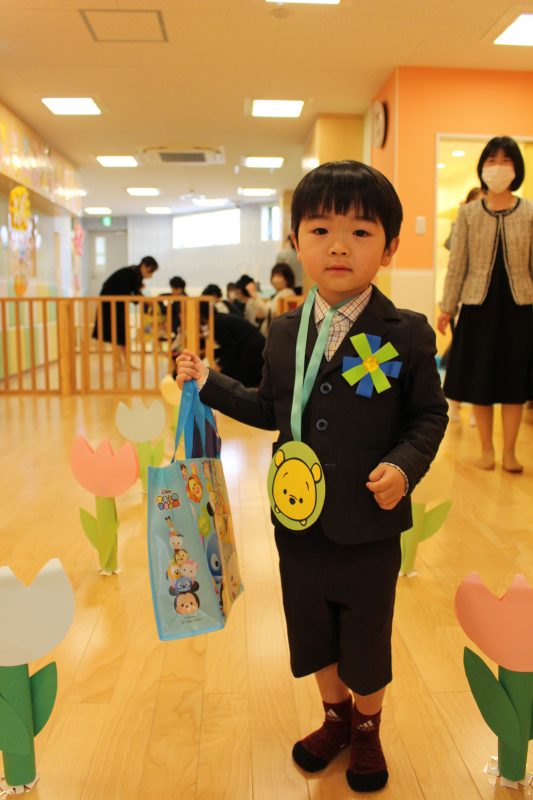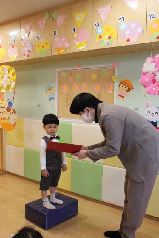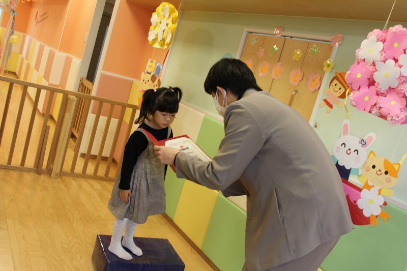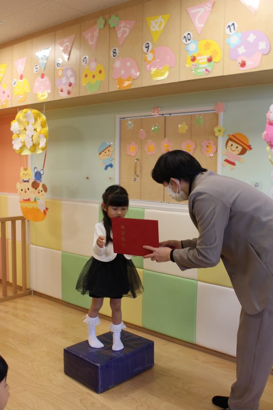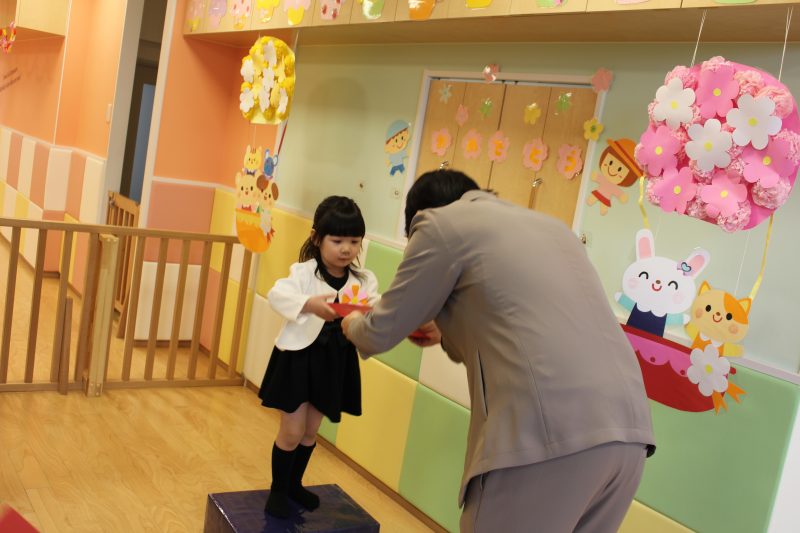順番に1人ずつ渡されて、お辞儀をしたりお話しを聞いたり、とても成長を感じる一面でした。