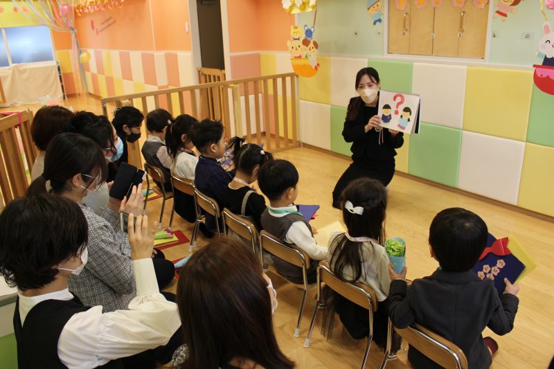 りんご組さんが集まった後は、園長先生よりお祝いの言葉が述べられて、いつもと違う雰囲気にわくわくどきどき。
