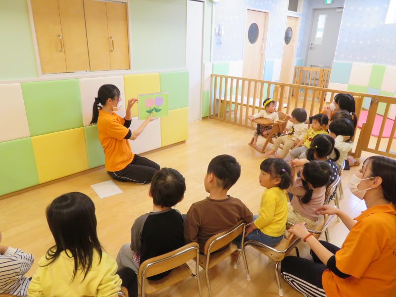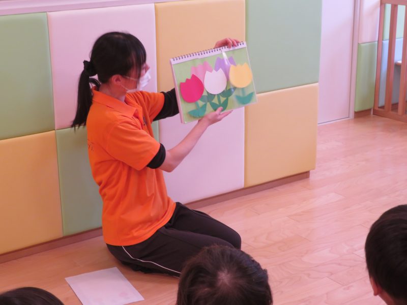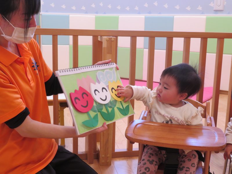 その後は、保育士からの出し物で春らしくチューリップの歌に合わせたスケッチブックシアターをみました![]()
