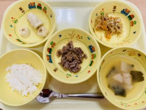 粥 味噌汁 鶏と野菜煮 だいこん煮 バナナ