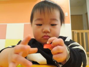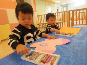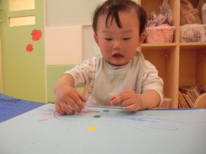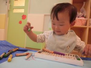 「僕は、沢山のクレヨンに大喜び」クレヨンを全部手に持ってみたり、画用紙の上をお散歩させたりして楽しまれていました