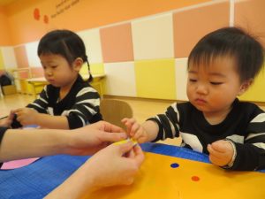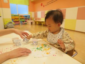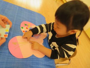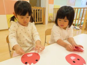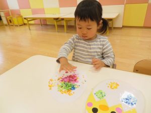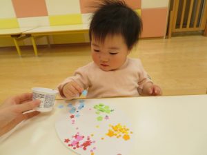 シール貼りでは、保育士から受け取ると手にくっつく感じを不思議そうにご覧になっていました