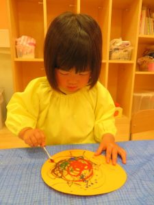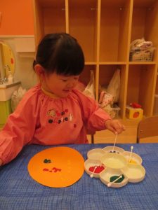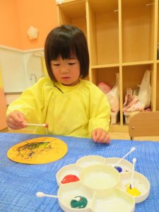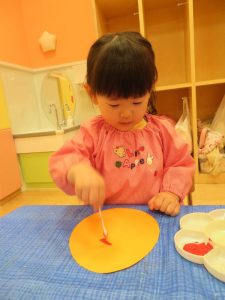りんご組さんは、絵の具を使って卵に、つんつんと綿棒アートをしました