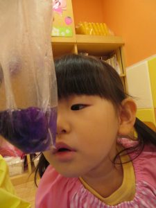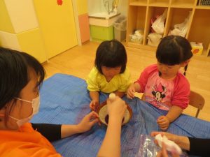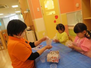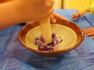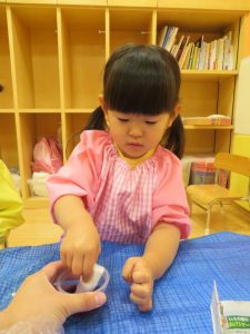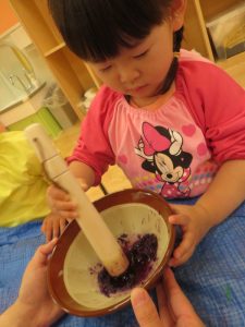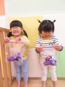 普段目にしているパンジーで製作をすることにしました。身近にあるパンジーやお花から、色が出せるということを知ることができるいい機会です。植物を使った色水遊びは、絵の具とはまた違った自然の色に触れることができ、新たな発見や経験に繋がります