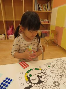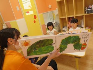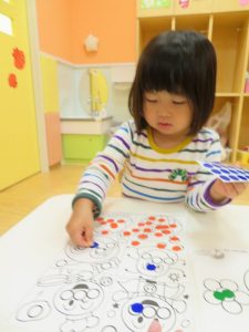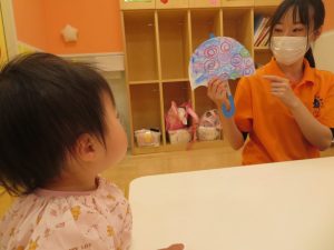 保育士が筆で色を塗っていくのを、目を輝かせながらじっと見つめていました![]()