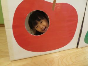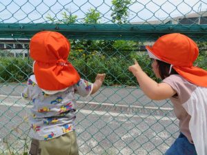 りんご組さんがいちご組さんに、「ほら、あそこ電車見えるよ