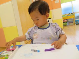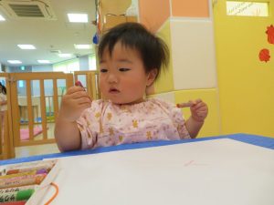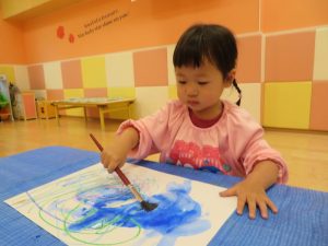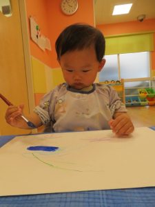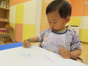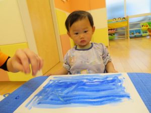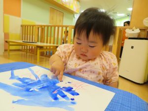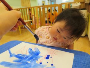 いちご組さんが、筆で塗り塗りと色を塗っている途中で、保育士が筆をもらいました。たっぷりと筆に色をつけると、筆から絵の具が落ちていく様子を、不思議そうにみるいちご組さんでした![]()