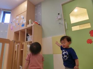 「見て」と指をさして、先程の風船だるまがあった場所をお友だちに伝えていました