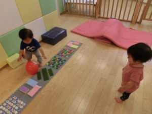 こちらは、センサリーマットです自分で感触を楽しんだり、先ほどの風船だるまをセンサリーマットの上に歩かせたりして楽しまれていました