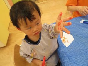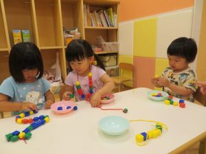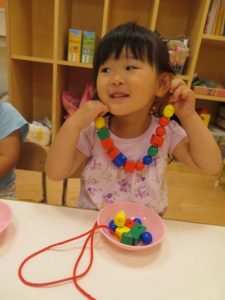 指先を使って、どの色を使おうか、友だちと同じ色にしてみようか、小さな穴にビーズを1つずつ通して取り組んでおられました出来上がると、「見て~」と嬉しそうに教えてくれました
