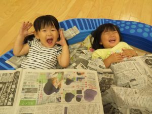 「じゃーん」と寝転がって、新聞紙を布団に見立て寝転がって楽しまれていました