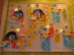 最後は、クレヨンを持ち、織姫様と彦星様のお顔を描いて仕上げました