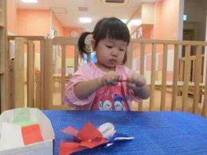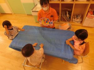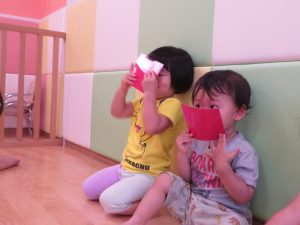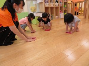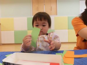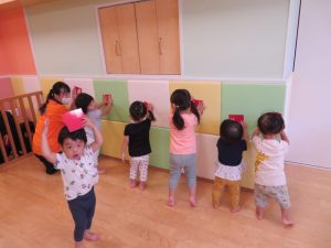 まず、1人ずつラミネートされた赤い四角の画用紙を受け取りました。1人ずつ、保育士に「どうぞ」と渡されると「ありがとう」と受け取り、何をするのかワクワクするお友だちの目が輝いていました![]()