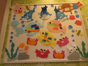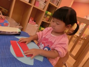 折り紙をちぎって、のりを使って折り紙を貼り付けました