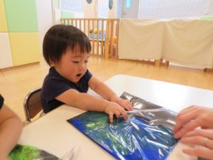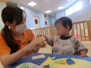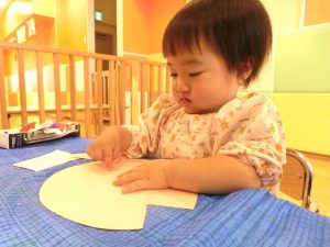 のりの感触を不思議そうにされたり、「ちょっとのりを使ってみよう」とお友だちや保育士とじっくりと楽しまれたりされていました。
