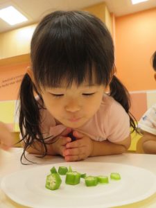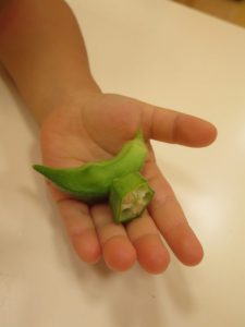 オクラを触れて笑みが溢れていました